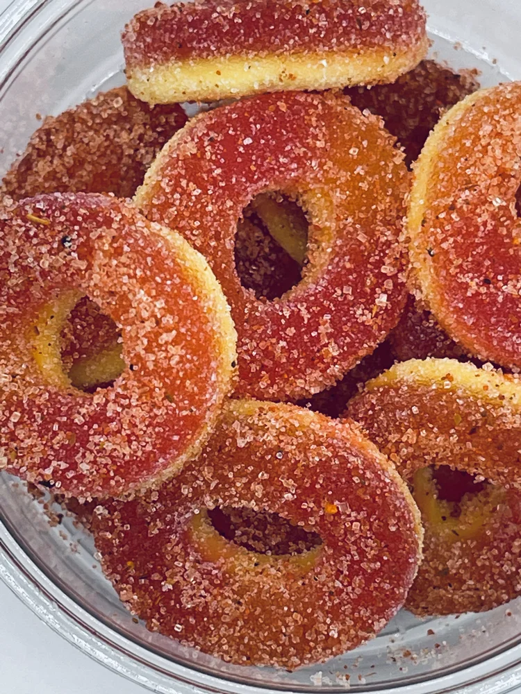 Chamoy & Xile Peach Rings dip in our chamoy sauce and our home-made spice seasoning recipe.