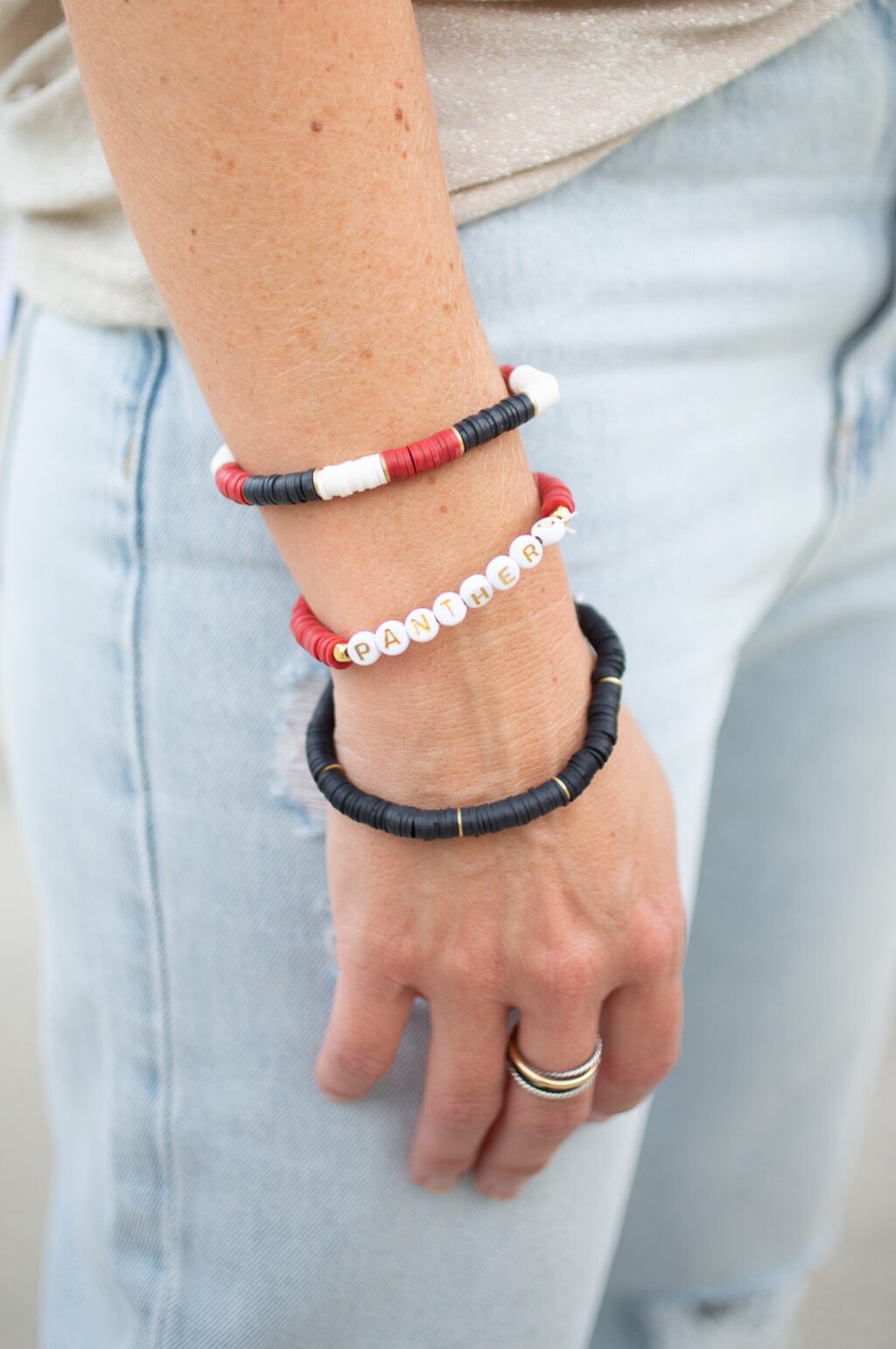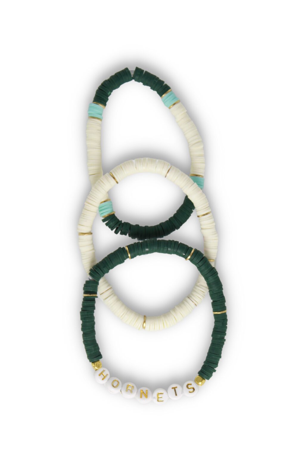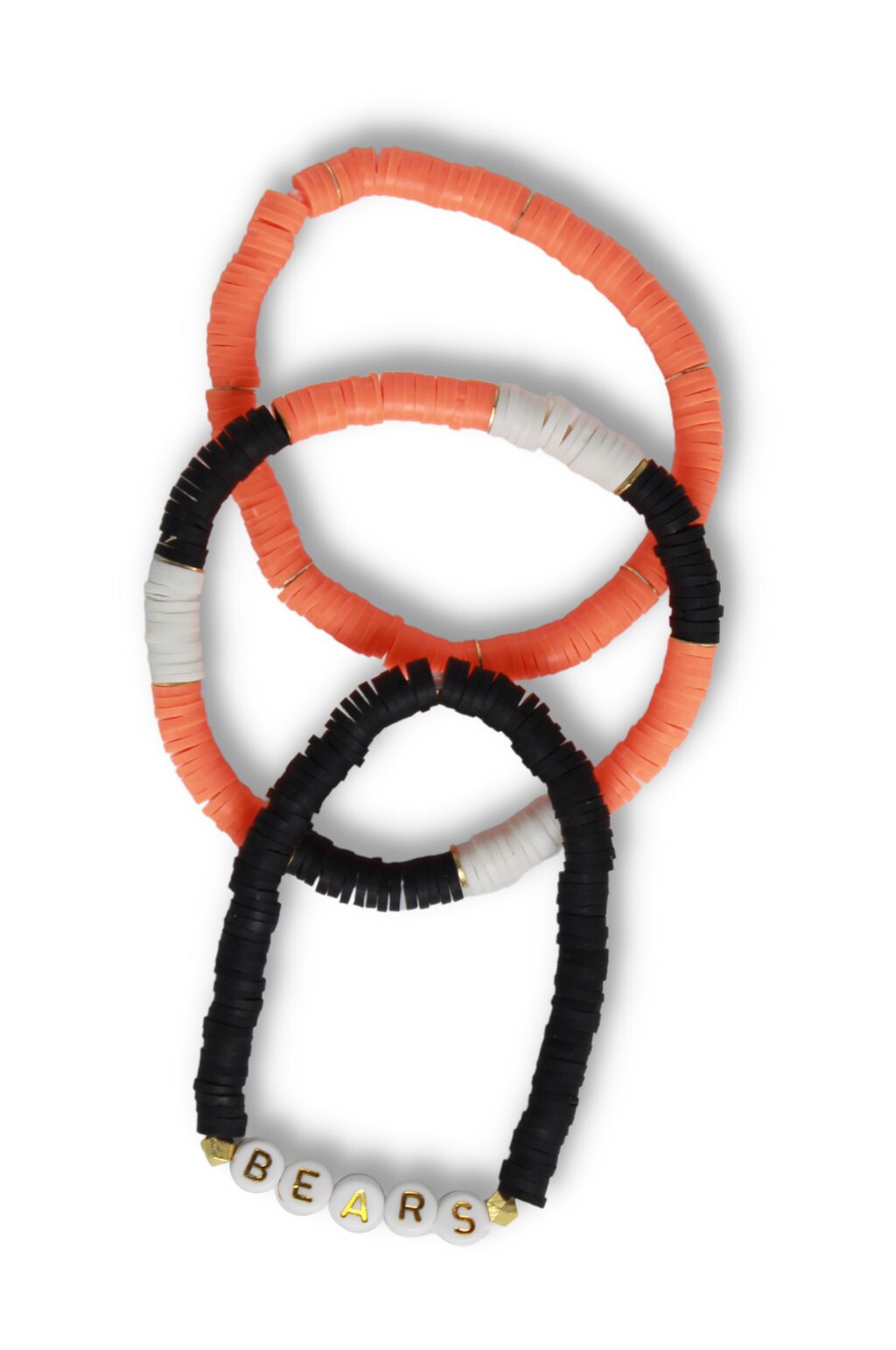 - Stack of 3 heishi bead stretch bracelets – Including one single word bracelet.