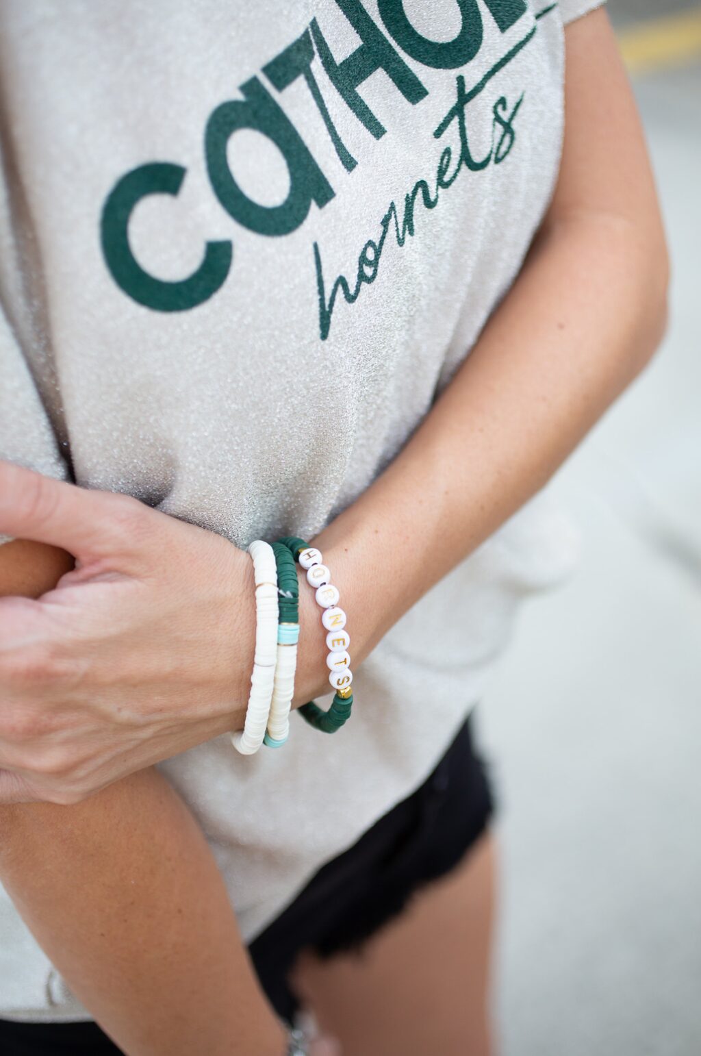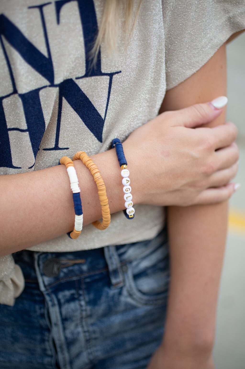 Take your team spirit everywhere with this fab stack heishi bead stretch bracelets! If your color your colors aren’t listed or you want to change the mascot, no problem, we can change that!