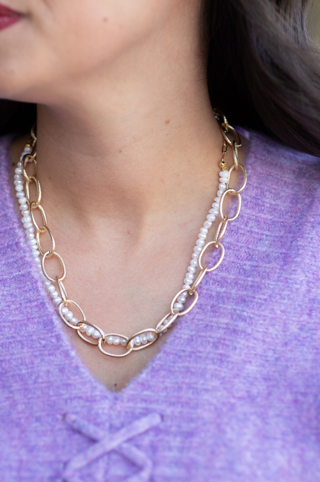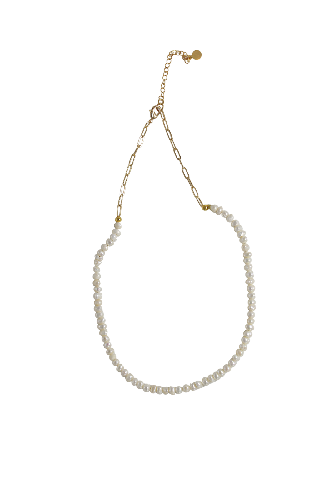 - Freshwater pearls linked to petite paper clip chain