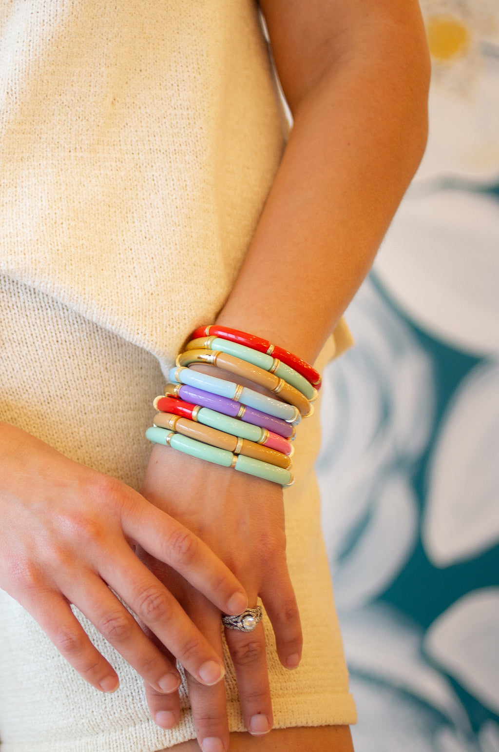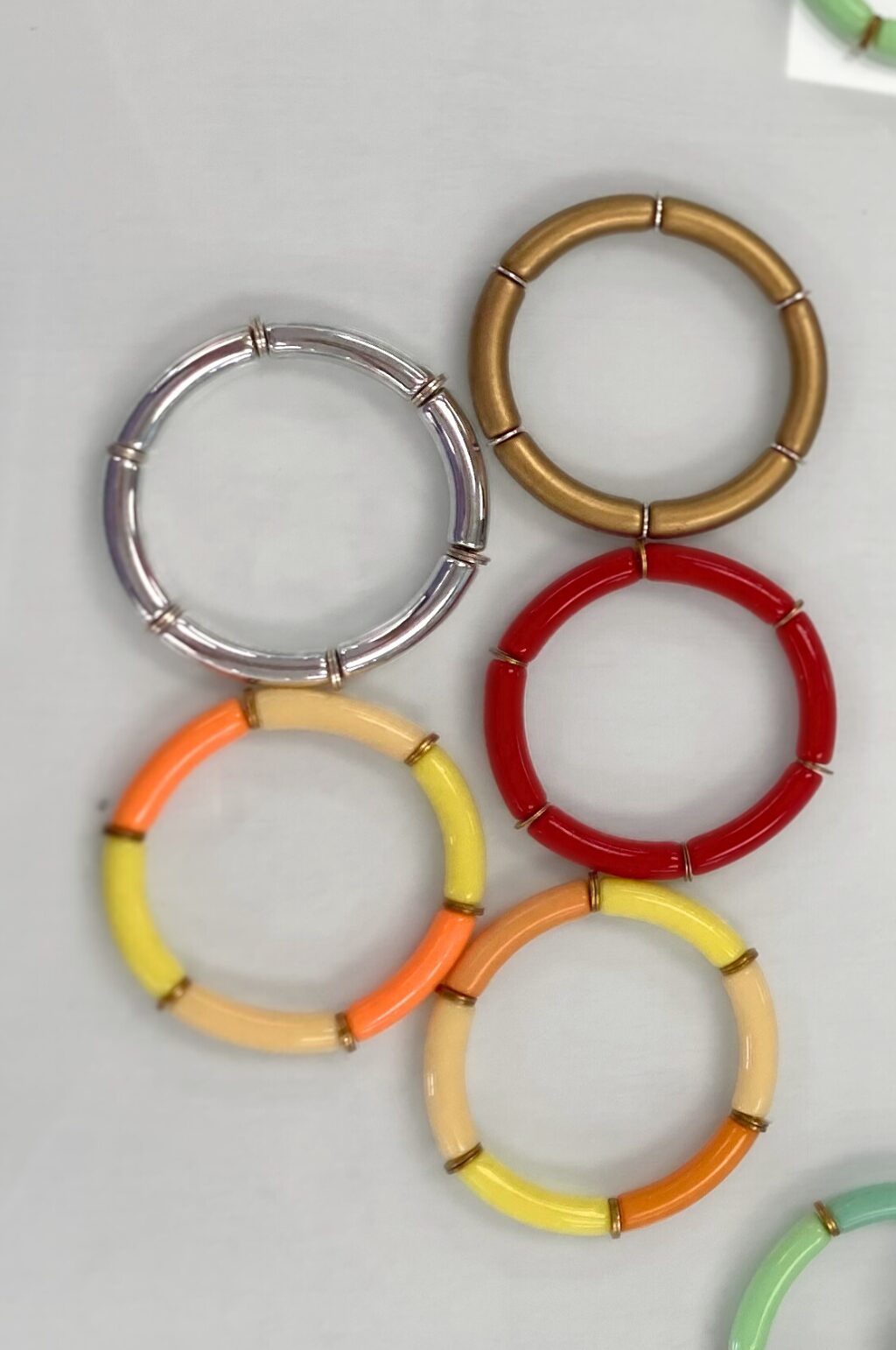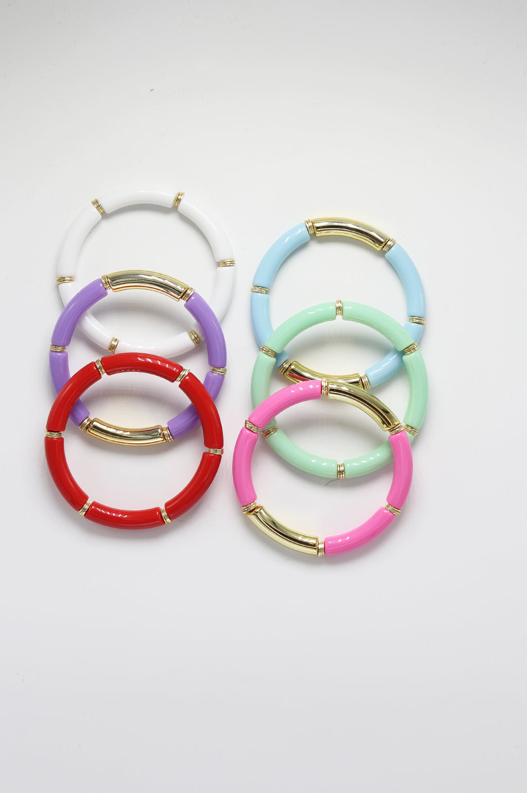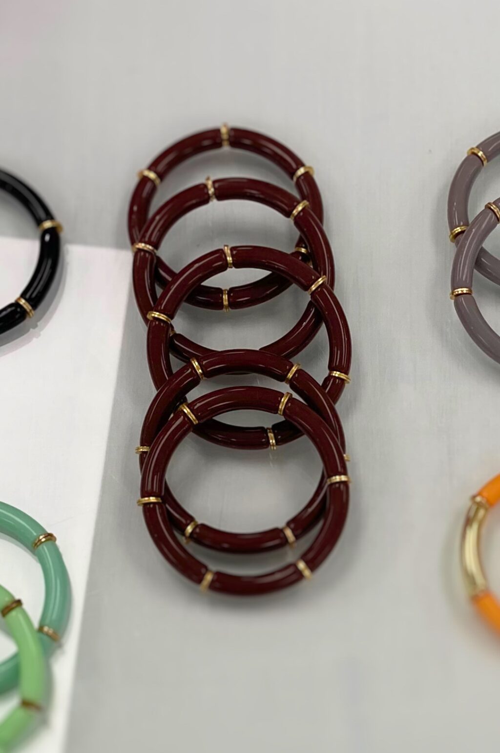 Elevate your wrist game to VIP with these bangle bracelets. Bangles available in a variety of colors with your choice of gold fillers – plain gold accents or gold bars.