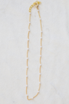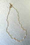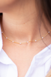 A dainty 14k gold plated pearl satellite chain necklace, worn lovingly by our Maggie, adds a touch of timeless grace to your everyday style.